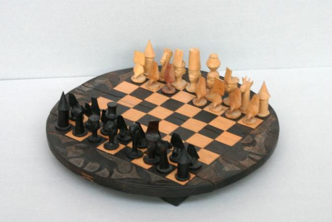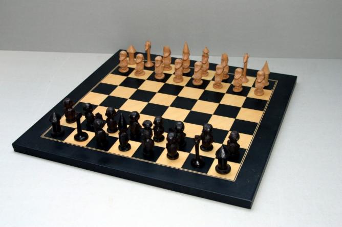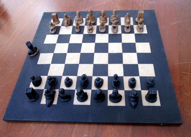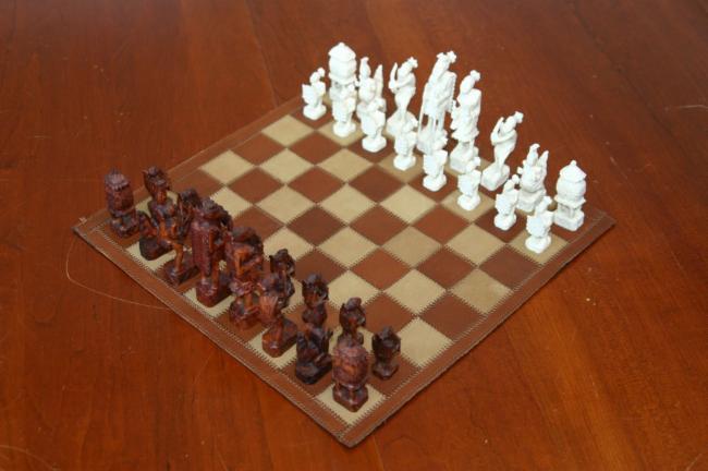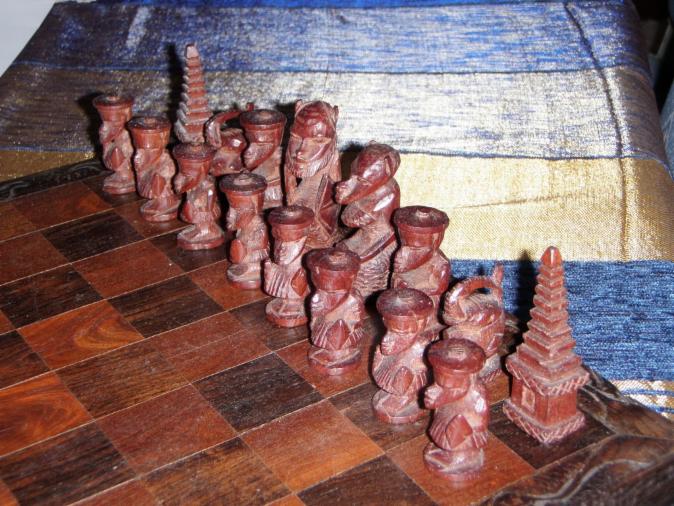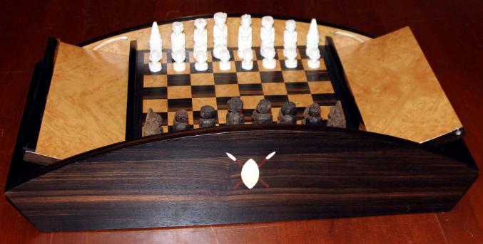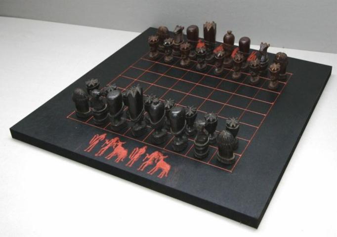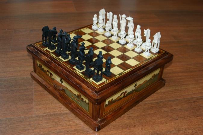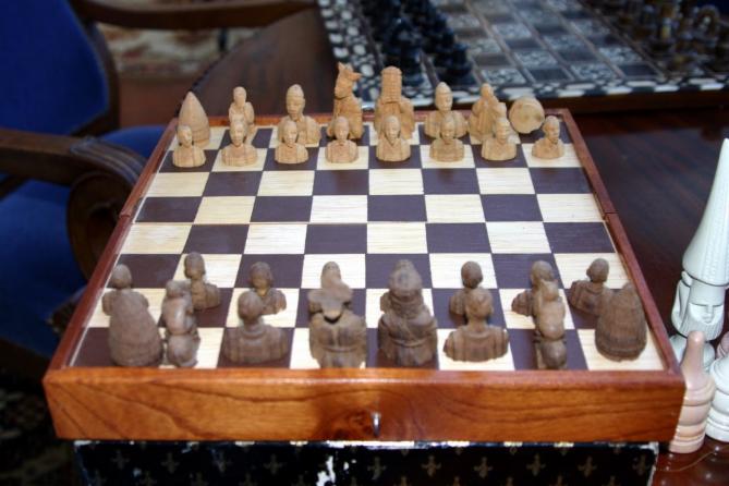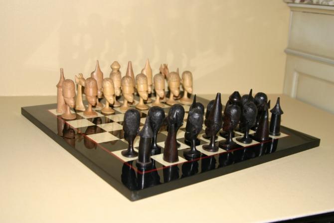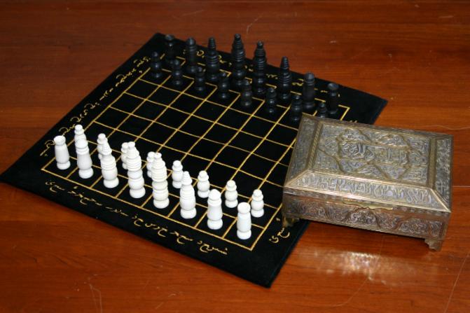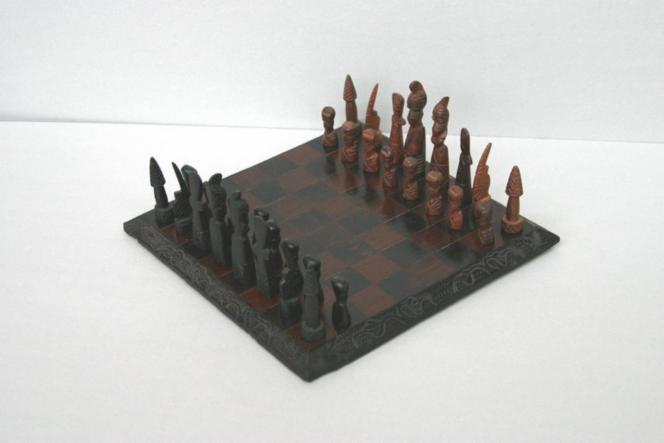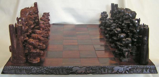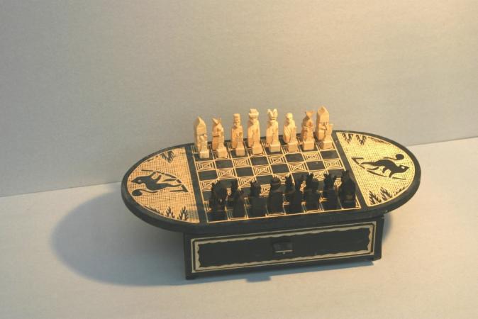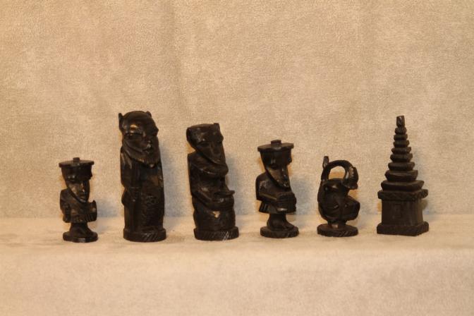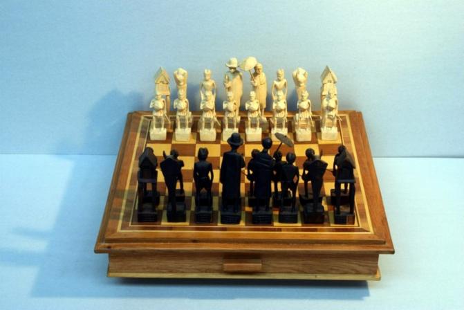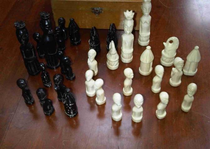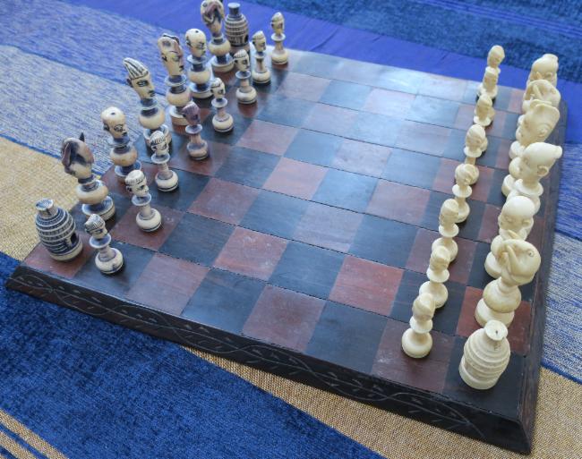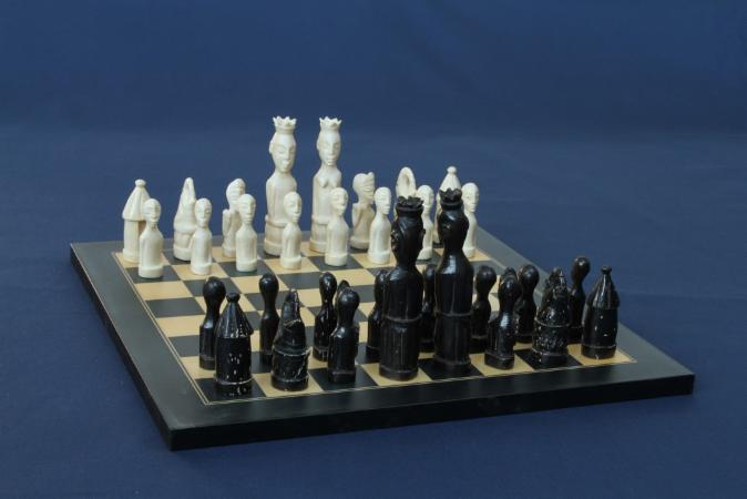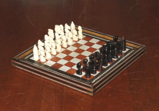 Jeu en ivoire. Ce jeu du début du 20ième siècle est unique du fait des pièces noires en ivoire peint qui semble indiquer qu'il était plus facile de trouver de l'ivoire que du bois à cette époque.
