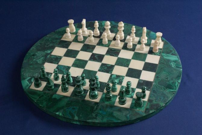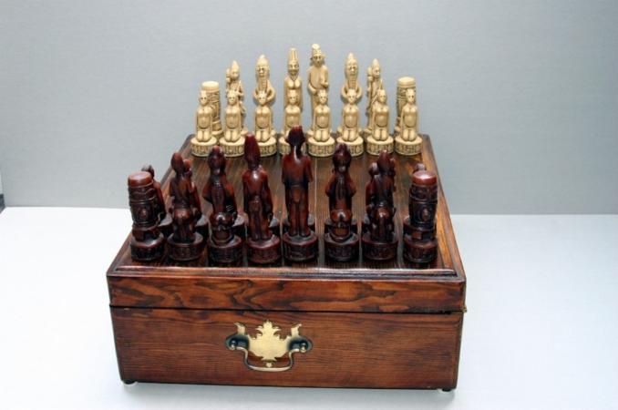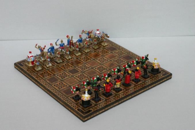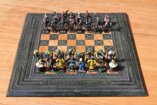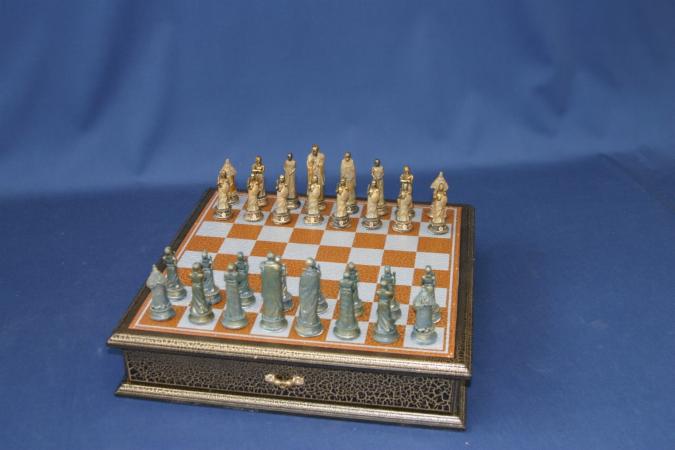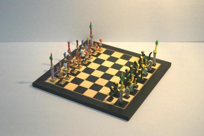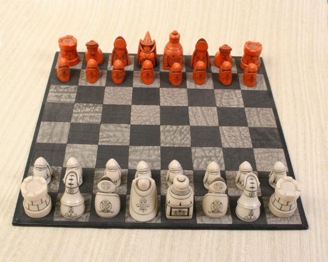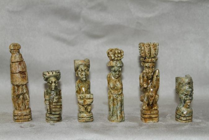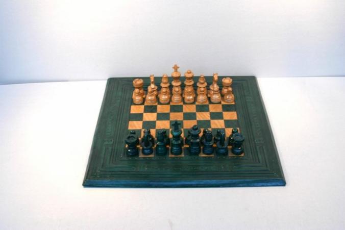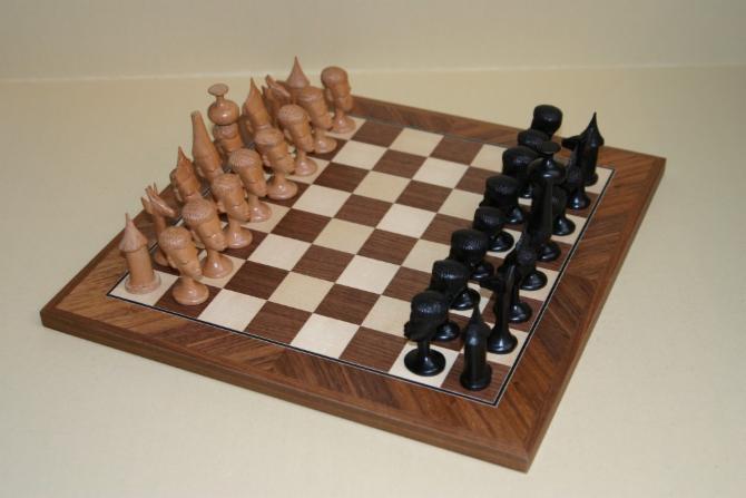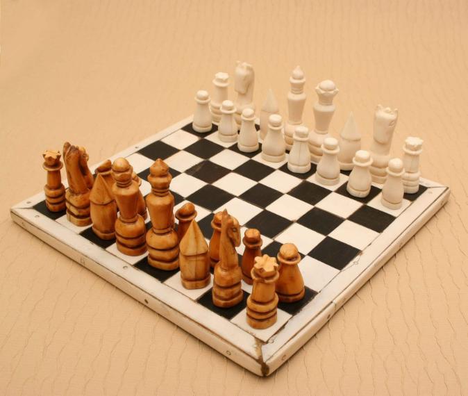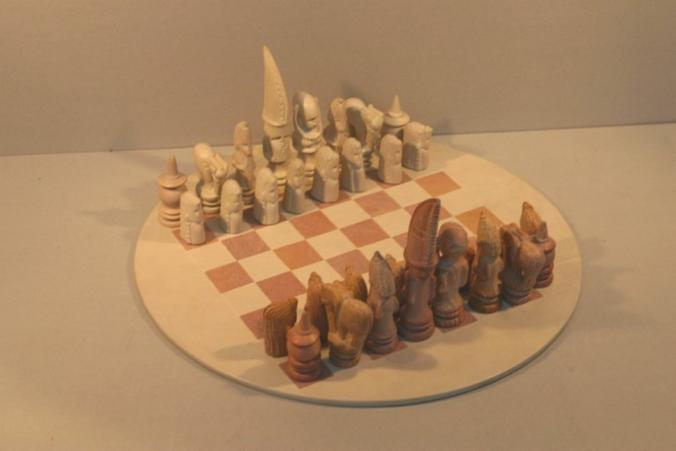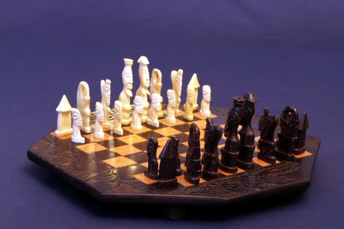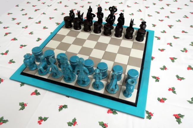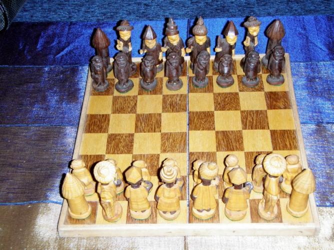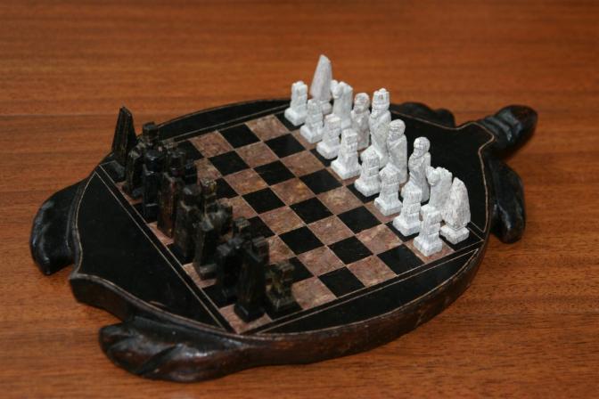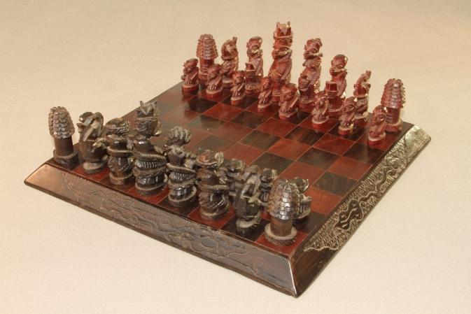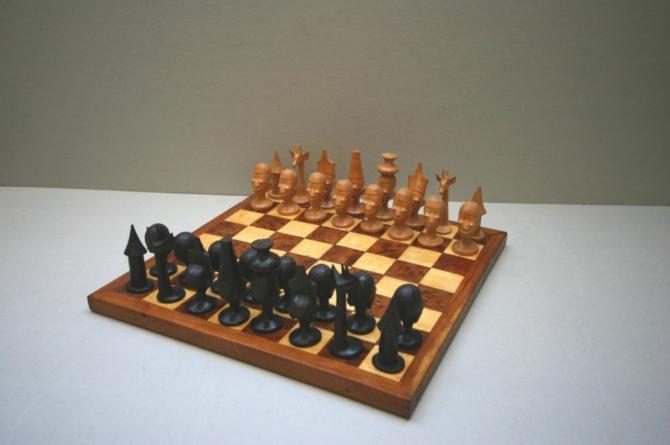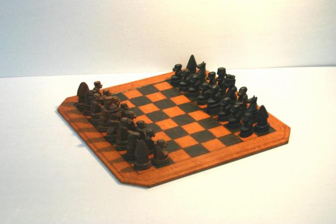 Jeu en ivoire. Ce jeu du début du 20ième siècle est unique du fait des pièces noires en ivoire peint qui semble indiquer qu'il était plus facile de trouver de l'ivoire que du bois à cette époque.