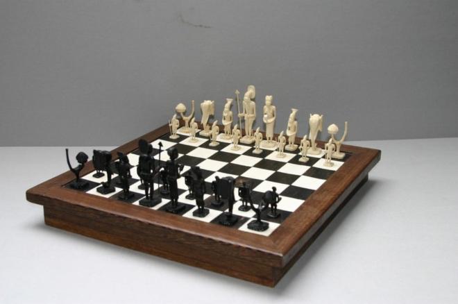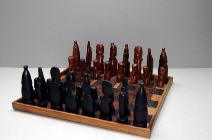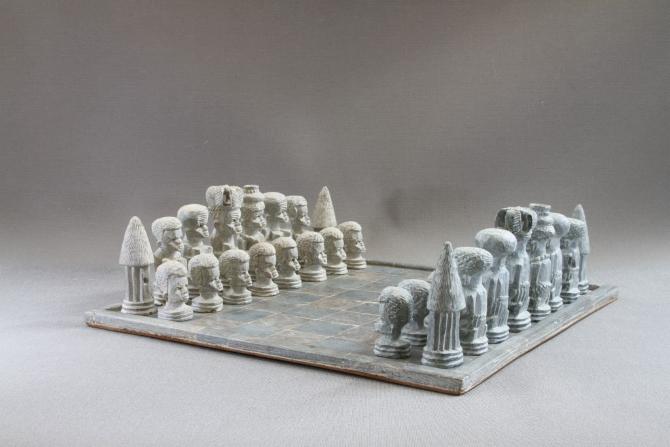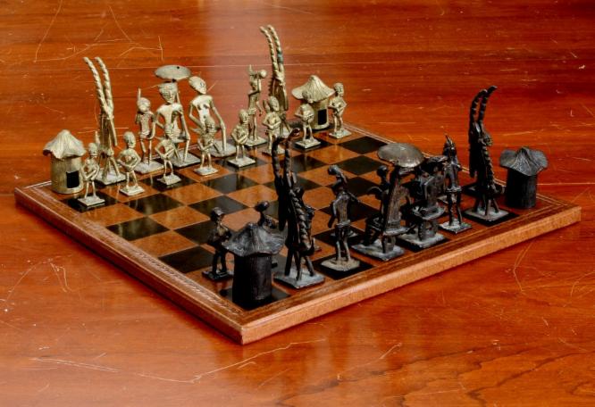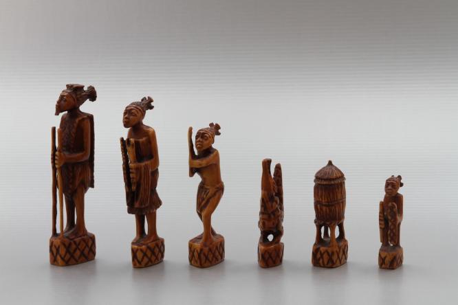 Jeu sur le thème tribal, en os et en bois dur, datant de la période coloniale et présenté sur un échiquier réalisé par l'ébéniste Guy Agenau.