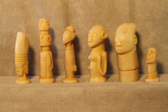 Jeu en ivoire d'hippopotame provenant d'une famille de colons belges, dans laquelle il est resté jusqu'à ce qu'il me l'offre en 1966. C'est le plus ancien jeu d'échecs africain que je connaisse. Il date du 19ième siècle et c'est le seul de cette époque dont on puisse confirmer l'ancienneté. Le style semble indiquer qu'il s'agit d'une commande à un artisan local, inspiré sommairement du style "Régence". Le plateau d'origine est assemblé par des chevilles ce qui semble confirmer son époque.