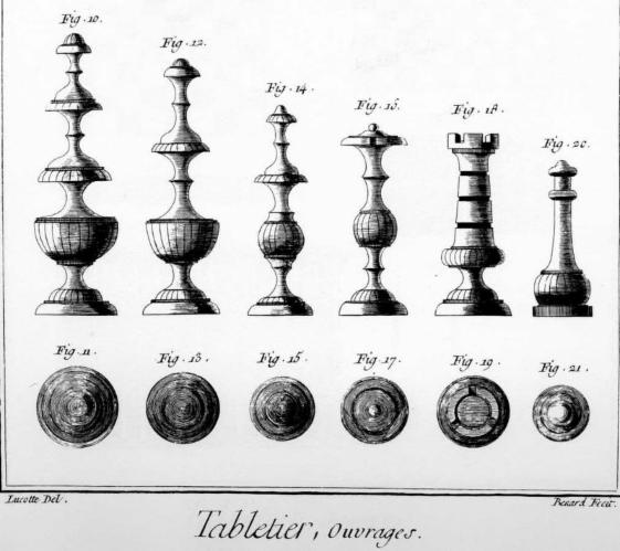 Comme ses deux concepteurs étaient de fervents joueurs d'échecs, habitués du café de la Régence, ils ont bien sûr consacré un article au noble jeu illustré d'un jeu de style régence, original par les canelures de ses pièces qui en font un modèle unique. Il est assez rare, jouissant d'une bonne notoriété du fait de sa présence dans l'encyclopédie.