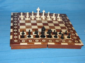 En ce qui concerne votre jeu, il n’est pas du tout français, mais indien. C’est une production typique en os pour les pièces et marqueterie de bois et d’os pour l’échiquier. Les pièces sont plutôt originales. Les modèles similaires que j’ai acheté datent des années 70 et valent aux alentours de 40 euros.