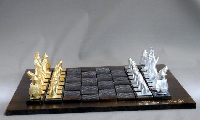 Salvador Dalí, marquis de Dalí de Púbol, né à Figueras le 11 mai 1904 et mort dans la même ville le 23 janvier 1989, est un peintre, sculpteur, graveur, scénariste et écrivain catalan de nationalité espagnole. Il est considéré comme l'un des principaux représentants du surréalisme et comme l'un des plus célèbres peintres du XXe siècle. Il admirait beaucoup Marcel Duchamp et a conçu un jeu d'échecs en son hommage. Il a également intégré un échiquier dans son célèbre tableau ' La renaissance de Narcisse".